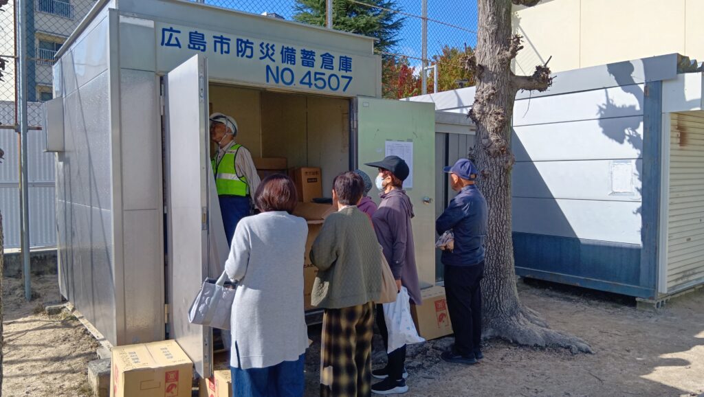 小学校校庭にある防災備蓄倉庫を見学しました。